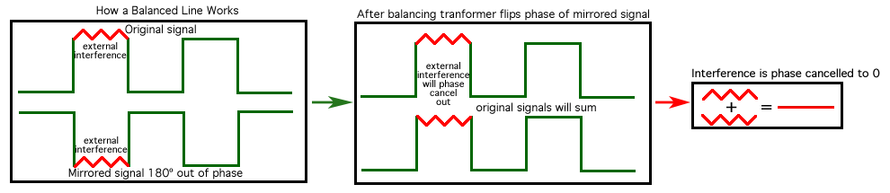 A balanced line is a two-conductor shielded cable connected to a balanced input which has a balancing transformer. The two conductors carry the same signal, but with reverse polarity (meaning that one conductor carries a signal that is the mirror image of the other). If external noise and interference enters the cable, it will probably affect both conductors equally. The input stage flips the polarity of one conductor, and combines the two conductors. This cancels out the noise and interference. Generally, balanced mixers and gear are more expensive due to the additional circuitry. The more typical single-connector connection with 1/4" mono jacks is unbalanced and hence more susceptible to ground hums and interference. Use balanced lines wherever possible.